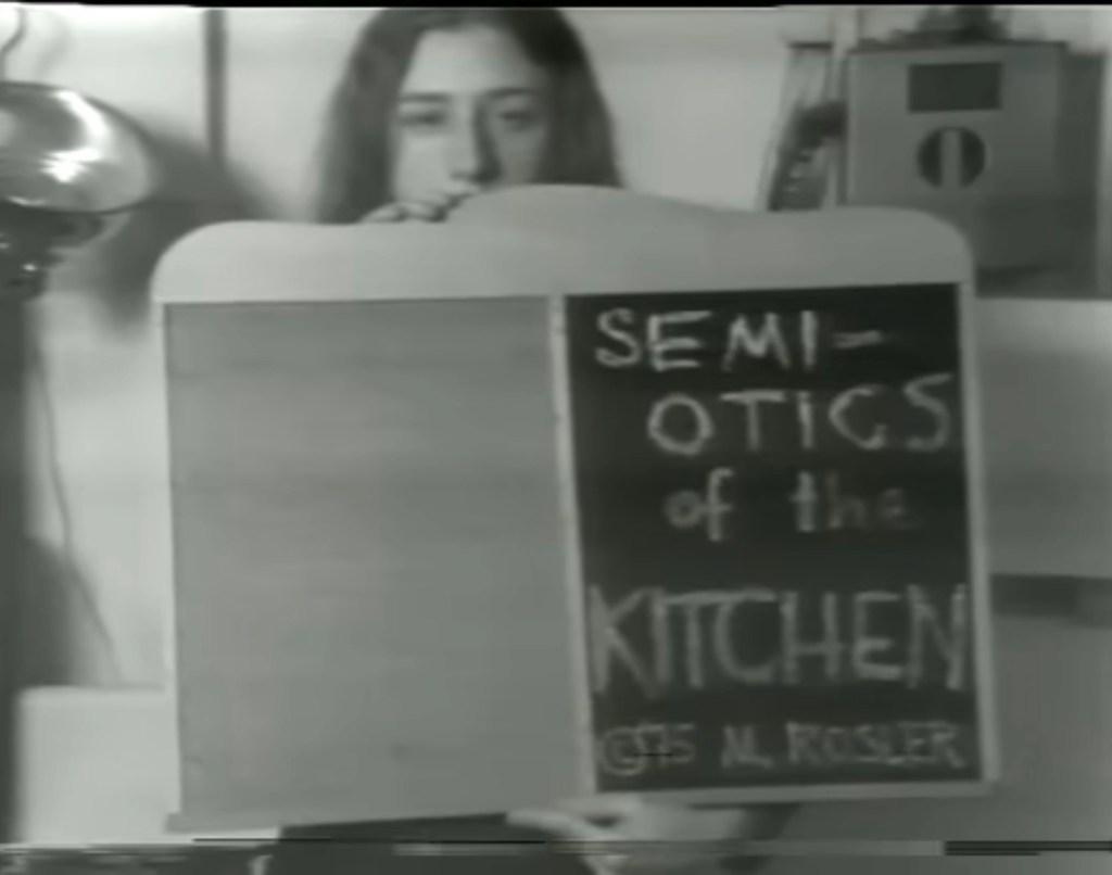 Martha Rosler’s Semiotics of the Kitchen (Rosler, 1975) was produced in the same cultural moment as The Stepford Wives and offers a visual parallel. Rosler’s performance transforms domestic utensils into symbols of the violence embedded in the expectation of feminised labour. Unlike Cheever’s erasure of the kitchen, Rosler and The Stepford Wives, (Forbes, 1975) foreground it as a space of discipline and containment.